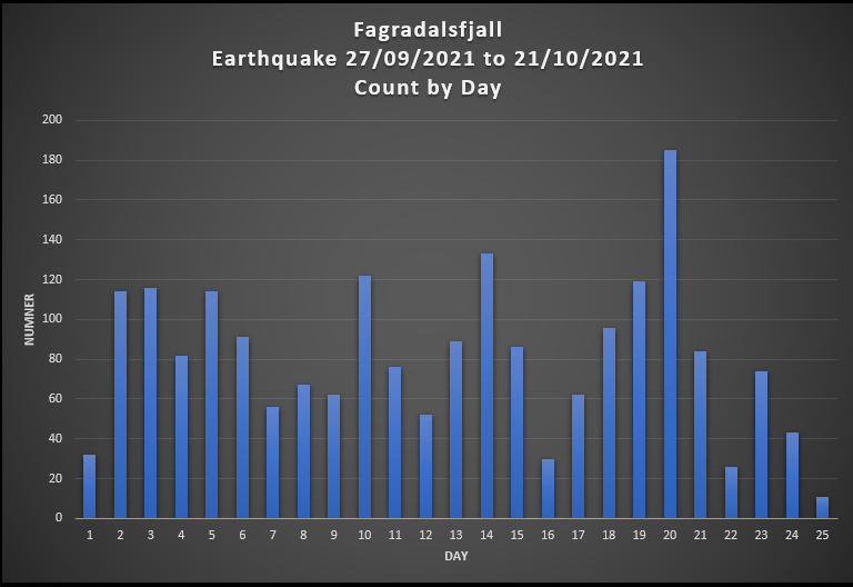 Fig 2:  Count by day in the confirmed earthquakes reported by IMO; plot by the author.  © Copyright remains with the author; all rights reserved, 2021.