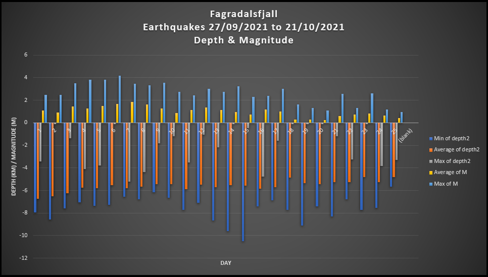 Fig 3:  Depths and magnitudes by day  of  the confirmed earthquakes reported by IMO; plot by the author. Blue columns are minimum depth (deepest); orange columns are average depth; grey columns are maximum depth (shallowest); yellow columns are average magnitude; and, light blue columns are maximum magnitude.  © Copyright remains with the author; all rights reserved, 2021.