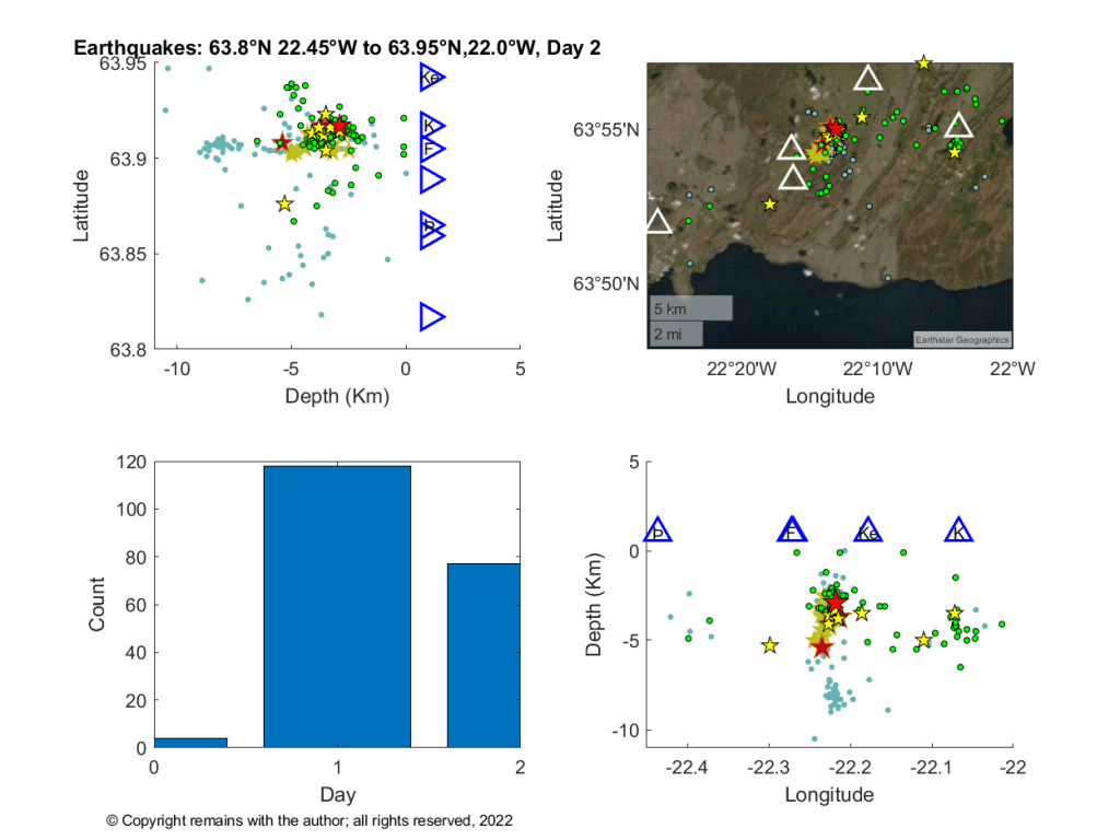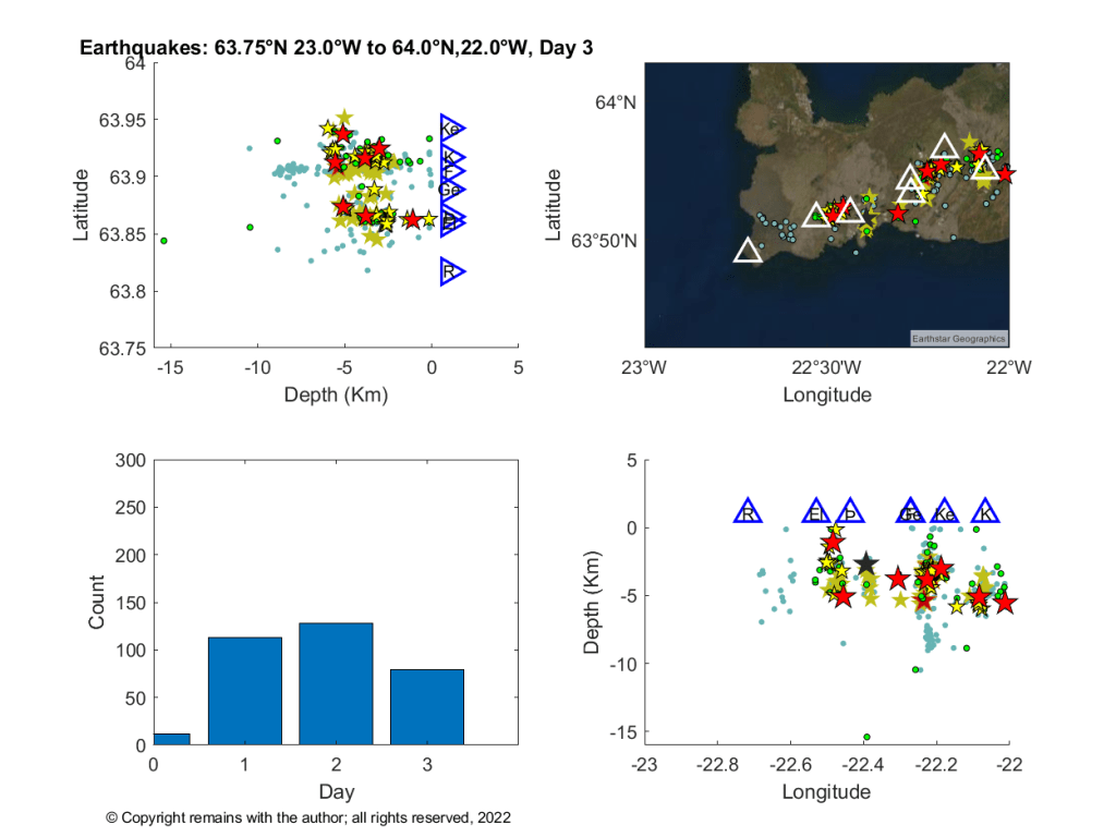 We have updated our earthquake plots using confirmed earthquake data from IMO’s Skjálfta-Lísa for the area 63.75°N, 23.0°W to 64.0°N, 22°W (the western Reykjanes Peninsula). The geodensity plot shows that most of the action is centred north east of Fagradalsfjall.