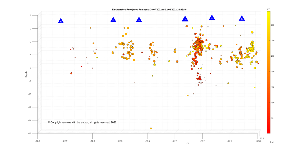 A large earthquake swarm started yesterday (30/07/2022) lunchtime north east of Fagradalsfjall, Iceland. At the time of writing, IMO had reported 1,597 earthquakes in the last 48 hours for the Reykjanes Peninsula from the SIL seismic network. This network automatically detects and locates earthquakes in Iceland and the surrounding offshore region. 199 of these earthquakes had been confirmed.