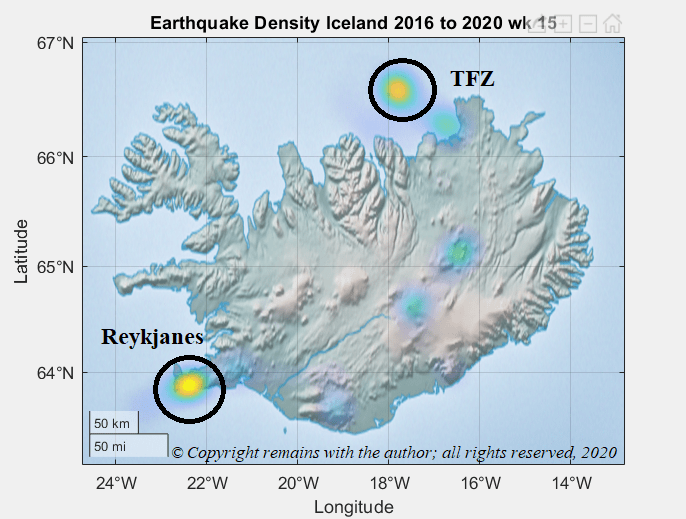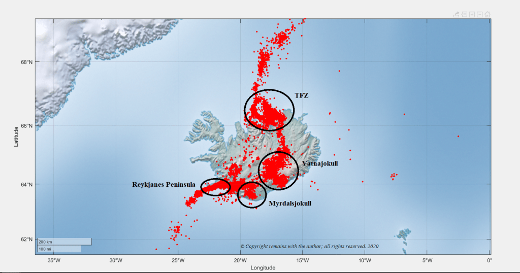 The MAR crosses Iceland in a series of transform and extensional faults, starting at the Reykjanes Peninsula in the south west to the Tjörnes Fracture Zone in the north. Plotting the earthquakes reported by the Icelandic Meteorological Office (IMO) from January 2016 to 12 April 2020 shows the path of the MAR.