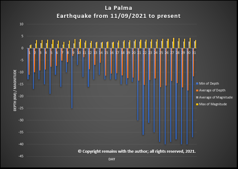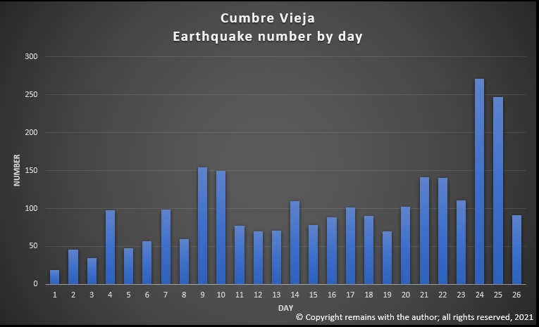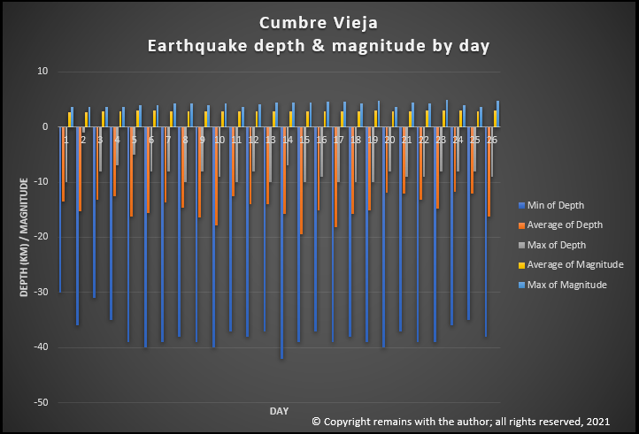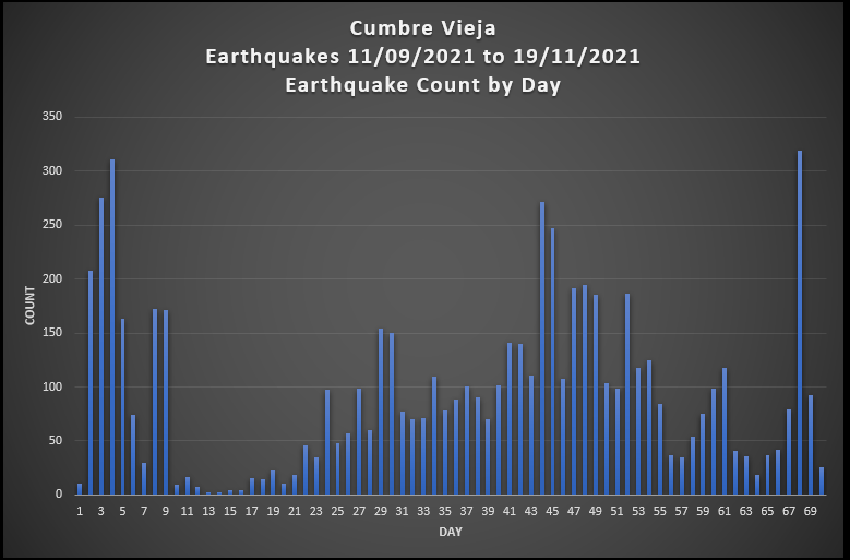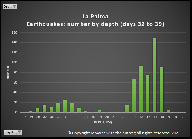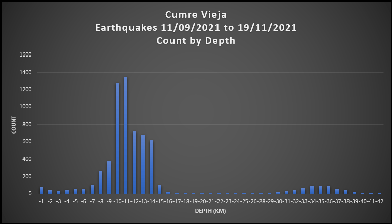 We have updated our earthquake plots to 19.10.2021 8:41:10. Since our previous update there has been more seismic activity, mainly between depths of 9-15km and 32- 42km. The former is consistent with the initial and subsequent stages of the swarm; the latter is consistent with the deeper earthquakes which started on day 21 (1.10.2021).