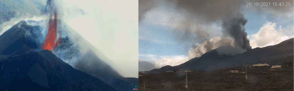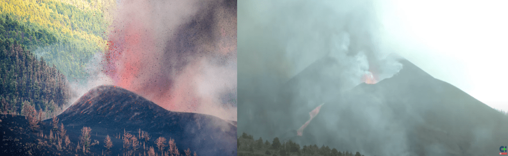 Fig 11: Cone growth. On the left, the new cone on 20 September, 2021, cropped from an image by Eduardo Robaina, published under CC BY-SA 3.0; on the right, screen shot earlier today from RTVC