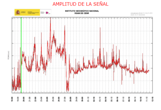 Fig 12: Amplitude of seismic signal, source: IGN. Green line denotes onset of the eruption.