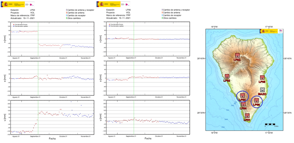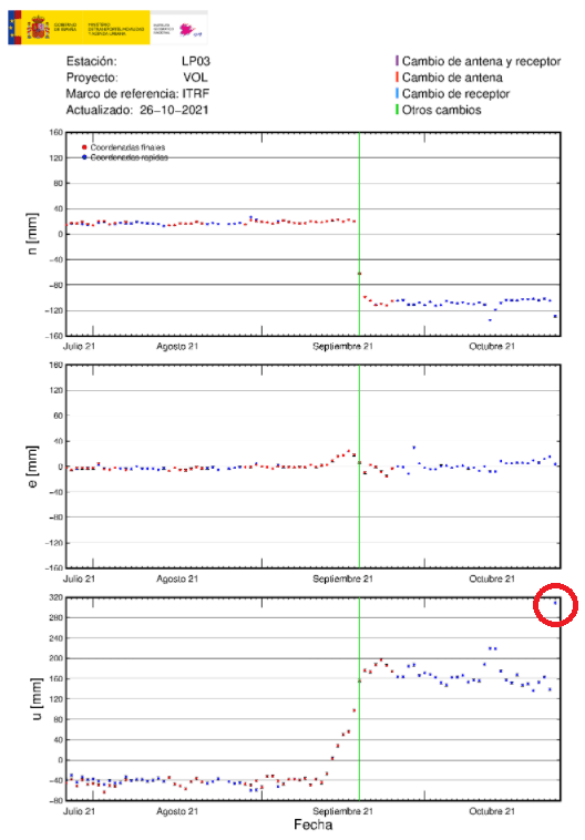 Fig 2: Ground deformation at the station nearest the eruption site. We have circled the latest data point to make it easier to spot. Green line marks the onset of the eruption (added by IGN). Source: IGN