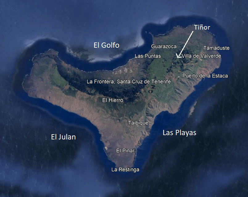 Fig 2: The island of El Hierro. Image captured from Google Maps, 2021. El Golfo, El Julan, Las Playas and Tiñor added by the author. The embayment of El Golfo can be seen as the cliffs encircling La Frontera.