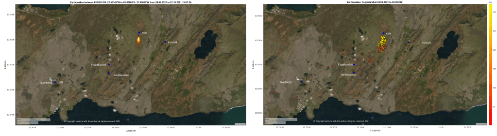 An earthquake swarm stared on 27 September 2021 south of Mount Kelir. This is located near the northern end of the earthquake swarms earlier this year which preceded the eruption at Geldingadalir.