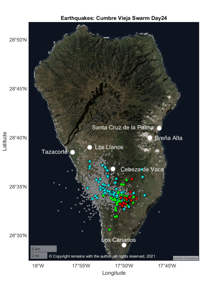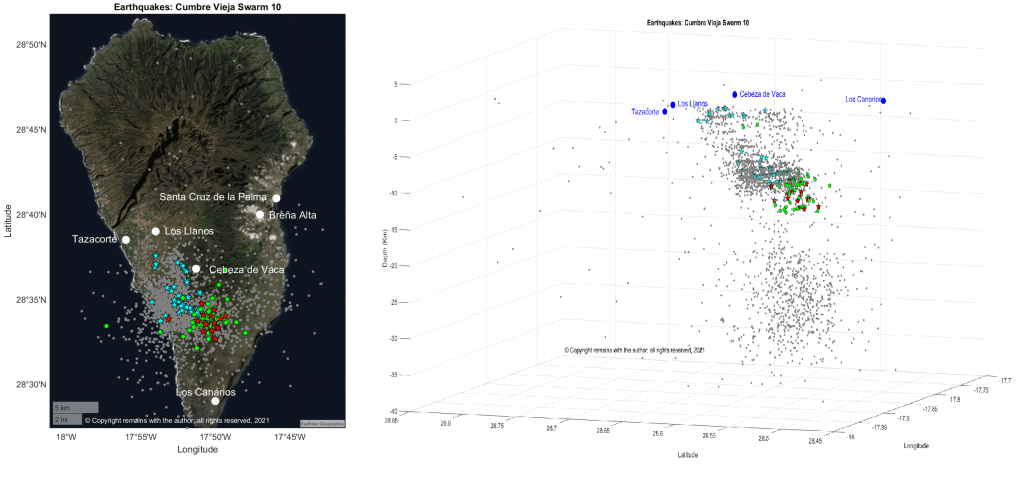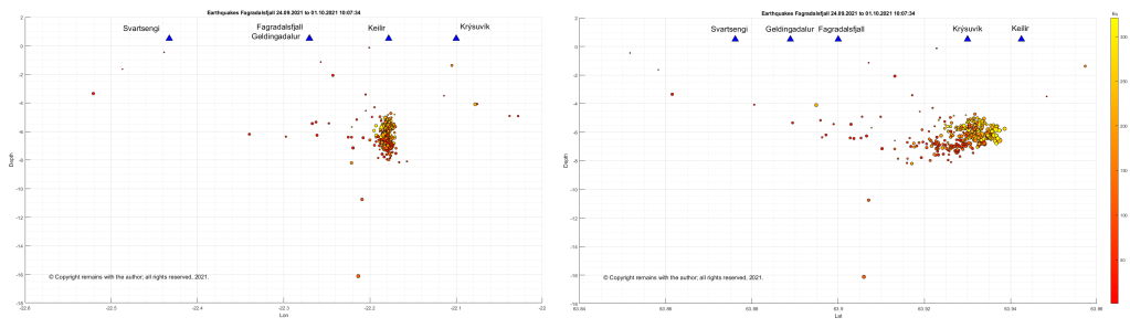 Earthquakes are occurring near the area start of the swarm which preceded the eruption. They are deeper than the earlier swarm leading to concern that lava may be fed from a deeper reservoir. We have plotted the current swarm and previous swarms from 2017 to date.