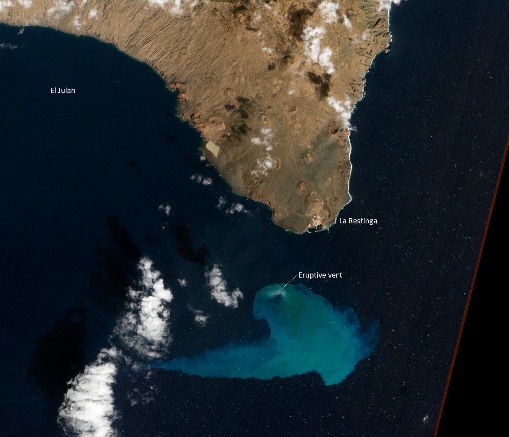 Fig 3: Stain from the submarine eruption south of the island. Image cropped from NASA Earth Observatory EOSDIS on 10 February 2012. Source: El Hierro Submarine Eruption (nasa.gov). “El Julan” and the “Eruptive vent” added by the autho