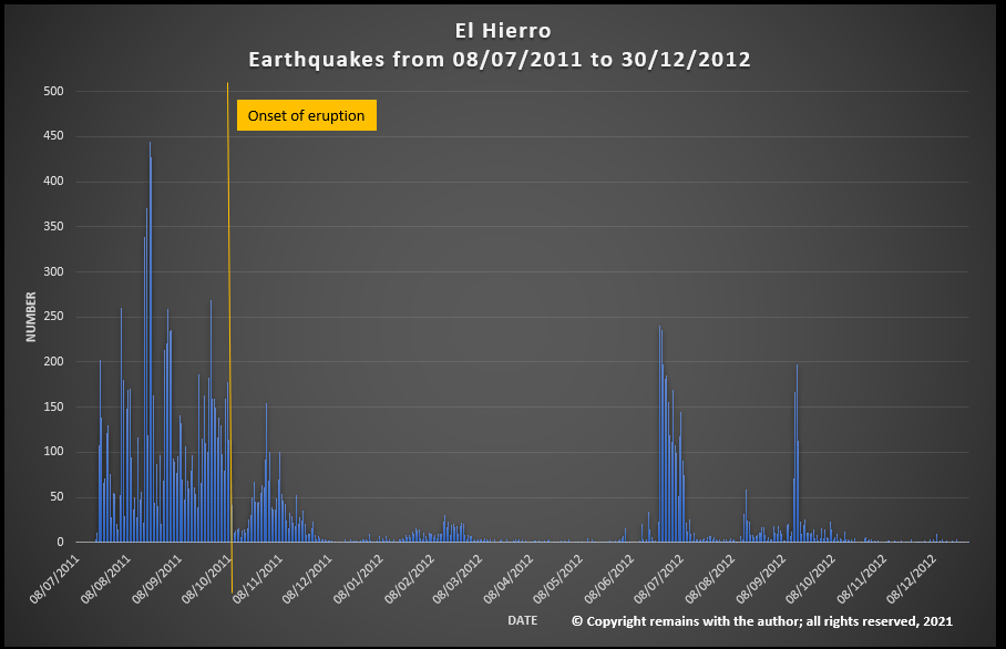 Magma movements were detected from seismic swarms. In June 2012,accompanied by rapid inflation, magma moved south-westward towards El Julan-La Dehesa, northwest of the submarine vent. Earthquakes picked up again in September 2012 indicating magma movement under Tanganasoga.
