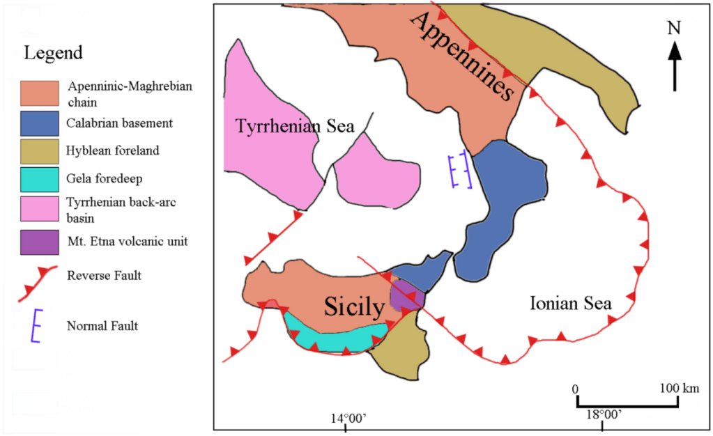 The main tectonic features of Sicily are the crystalline units of the Calabrian arc; the Neogene Maghrebian fold and thrust belt created during the opening of the Tyrrhenian Basin; the Catania – Gela foredeep; and the Hyblean Plateau.