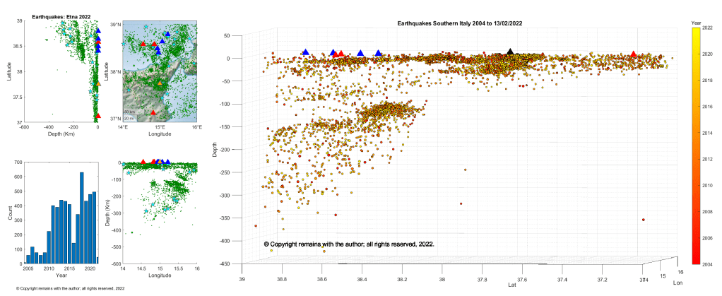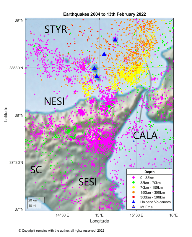 We have plotted earthquakes downloaded from EMSC for the period 1st October 2004 to 13th February 2022 for the area 37°N, 14°E to 39°N, 16°E.