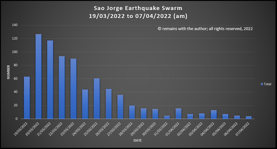 On 19 March 2022 an earthquake swarm started on São Jorge, an island in the Azores. The swarm is ongoing at the time of writing. By 28 March 2022, c.14,000 earthquakes had been recorded. This swarm is likely to be caused by a magmatic intrusion.