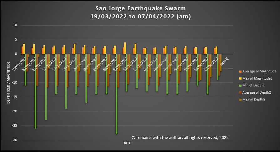 The earthquake swarm is continuing on São Jorge as we write, albeit it at a much lower intensity. The swarm is located on the Manadas Fissure system. INVOLCAN has sent a team to assist the local scientists (CIVISA and IVAR). CIVISA advised on 6 April 2022 that volcano-tectonic earthquakes had been detected suggesting magma movement at depth.
