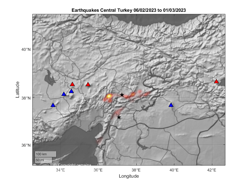 We initially plotted the earthquakes from 1 January 2023 to 25 February 2023 for the area 34.47361°N, 25.22222°E to 42.25833°N, 44.45056°E. We then looked at 35.3122°N, 32.50944°E to 41.21667°N, 42.70056°E, focussing on the East Anatolian Fault. The results are shown in the following videos and earthquake density plot.