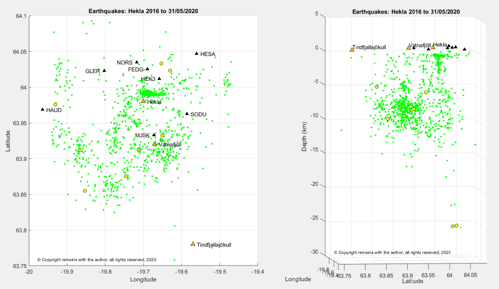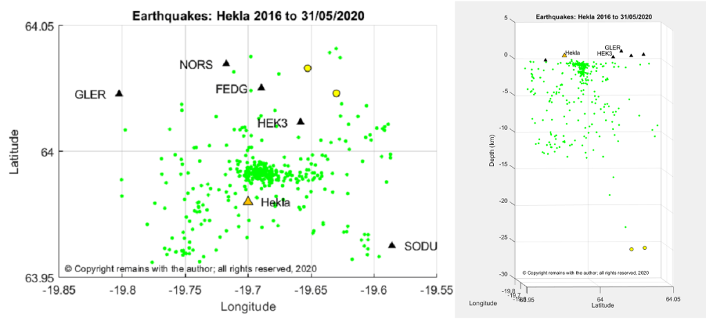 From the data set of earthquakes downloaded from IMO’s site for period 1 January 2016 to 31 May 2020, we extracted those for the Hekla – Vatnafjöll area: 63.7578°N, 19.4687°W to 64.0952°N, 19.9399°W. We found 1,018 earthquakes, compared to Katla’s 6,505 for the same period. The largest quake was 2.62 and the deepest 25.11km.