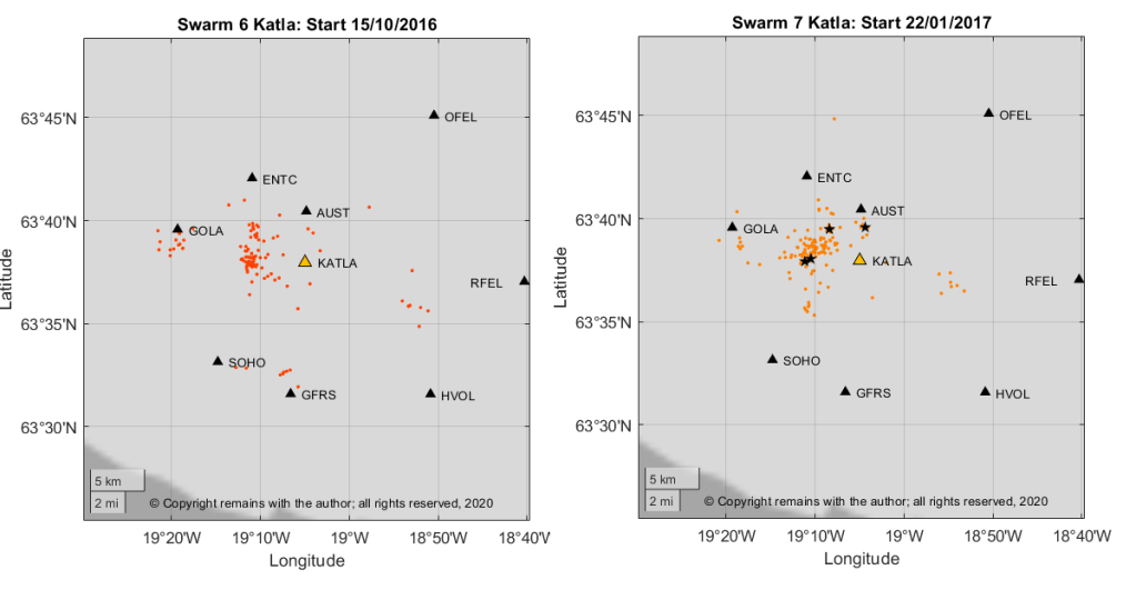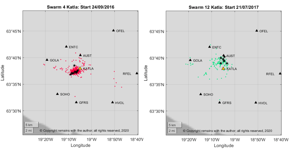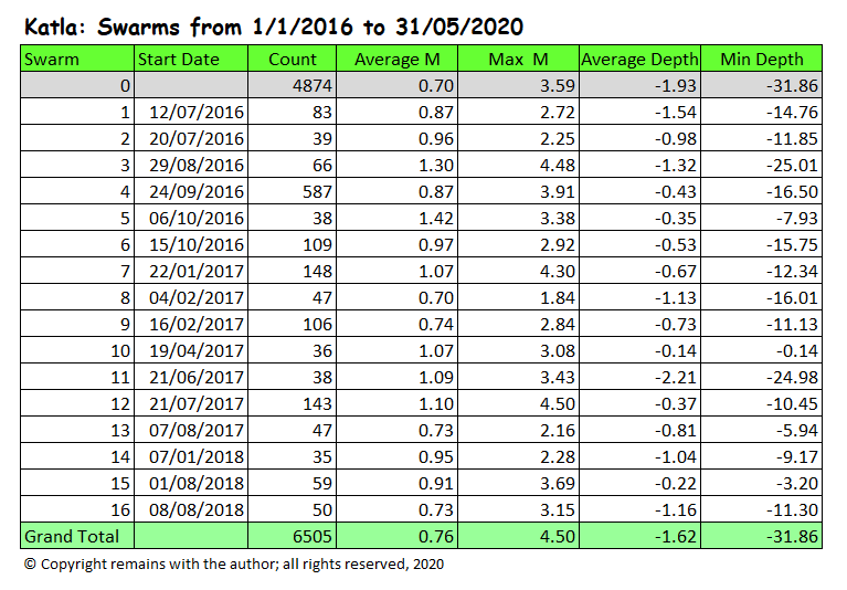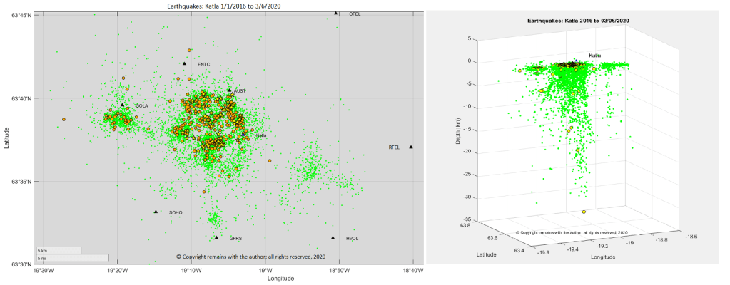 We extracted the earthquakes for Katla from the above data set using the coordinates 63.785°N, 19.4987°W to 63.4547°N,18.6608°W. This produced 6,505 earthquakes for the period 1 January 2016 to 31 May 2020.
