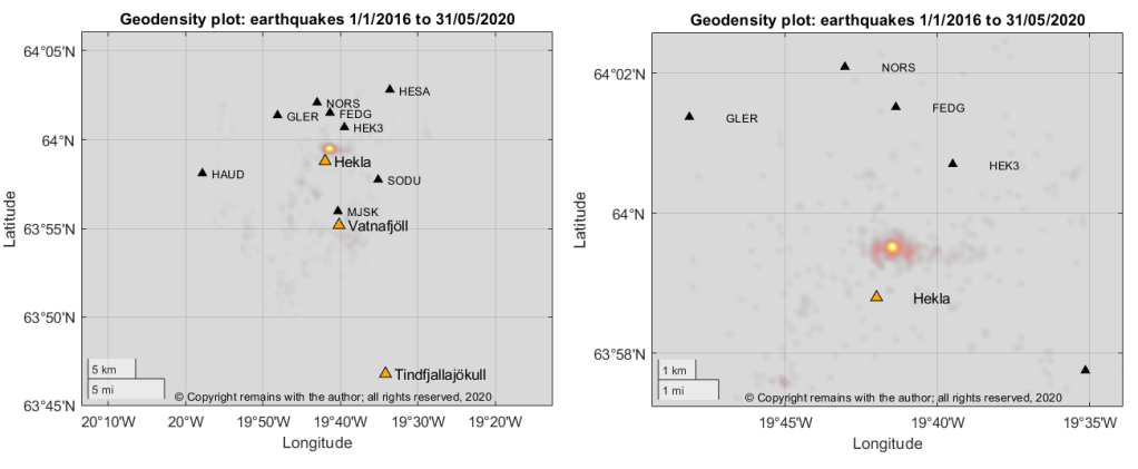 We looked for swarms in the data set to see if these account for the hot spot but did not find any large ones; the hot spot appears to be an accumulation of activity over the period. Hekla seems to have a slow magma feed.