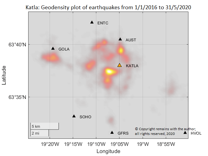 We updated our earthquake dataset so we are now looking at the period from 1 January 2016 to 31 May 2020. Apart from the continued swarm on the Reykjanes Peninsula, there has not been any unusual activity (to the untrained eye, at least). We used IMO’s latest earthquake map for Mýrdalsjökull as an indicator for the coordinates to extract the data for the region. This picked up five seismically active volcanic systems (Eyjafjallajökull, Hekla, Katla, Torfajökull and Vatnafjöll) and three inactive areas (Krakatindur, Þórólfsfell and Tindfjallajökull).