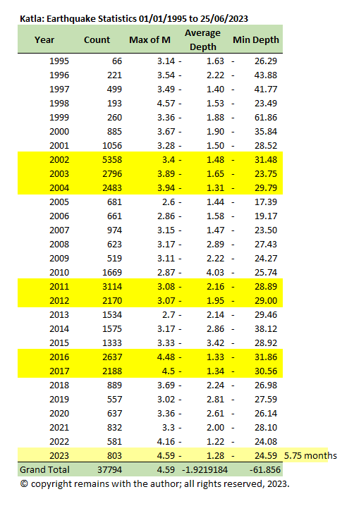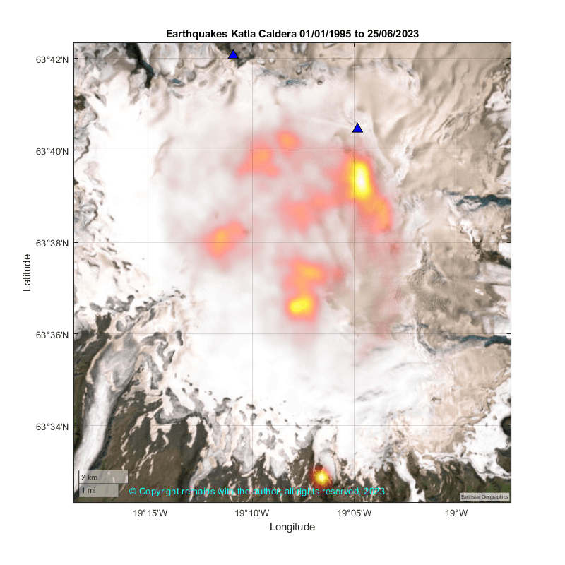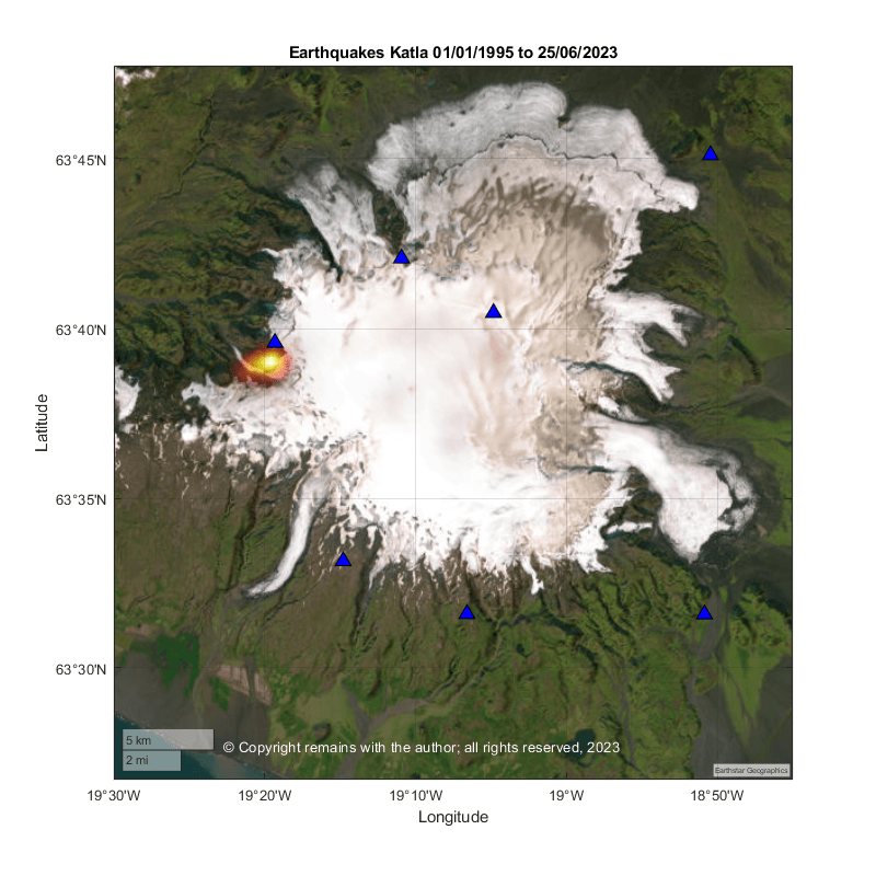 So we took a moment to update our Iceland earthquake database to 25th June 2023 (the earthquake list for week ending 2nd July 2023 is not yet available, although they can be viewed on Skjálfta-Lísa (vedur.is)) and plot the earthquakes at Myrdalsjökull, 63.1°N,18.5°W to 64.2°N,20.00°W, and then the caldera area, 63.45°N,18.98°W to 63.72°N, 19.24°W from 1st January 1995 to 25th June 2023.
