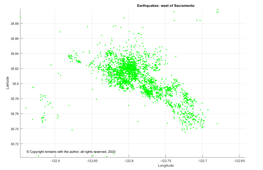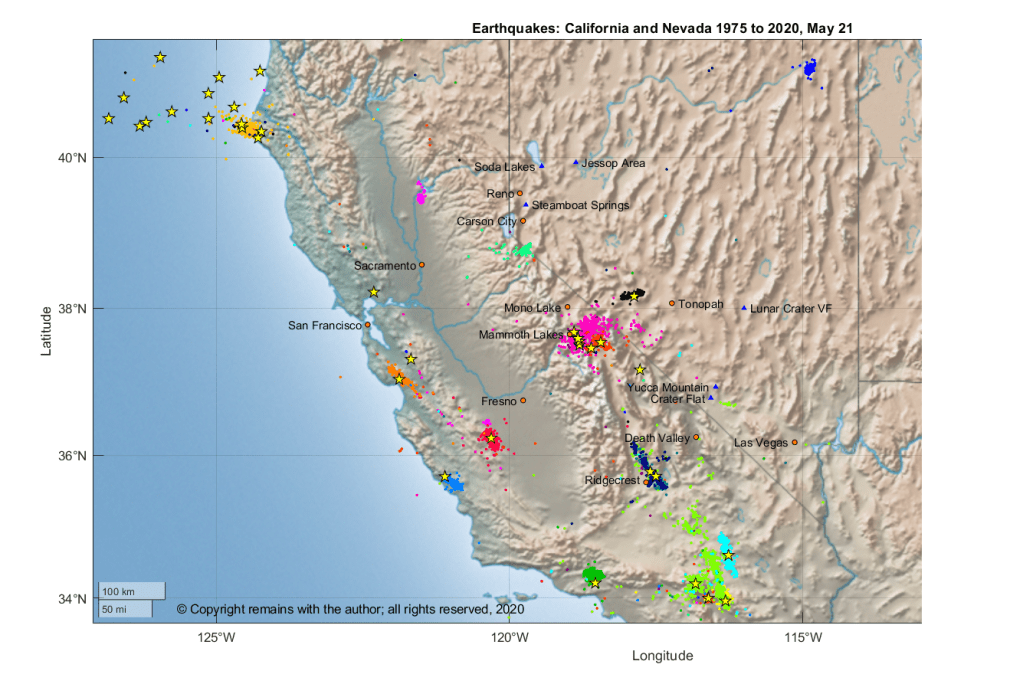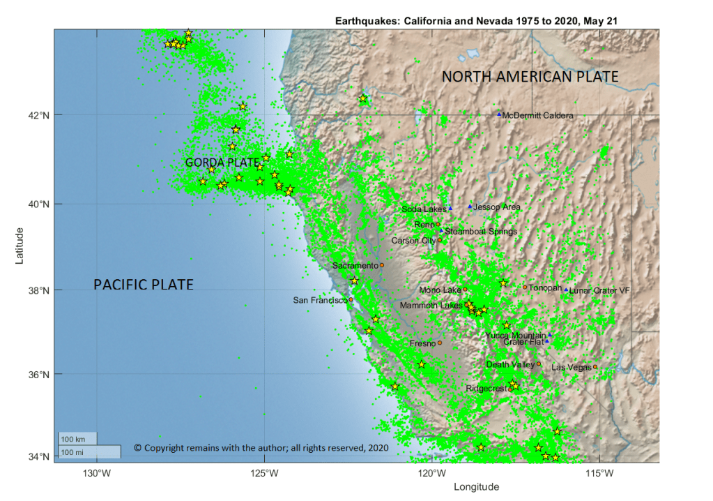 We downloaded the earthquakes between 39.470°N, 130.808°W and 50.870°N, 118.696°W from 1975 to 31 May 2020 to see what the subduction zone below the Cascades looks like. There were 18,173 quakes over 2.5, of which 48 were between 6.0 and 7.0 and 4 had magnitudes in excess of 7.0. We found two areas where there was some evidence of subduction, one at the northern end of the region (north of latitude 45°N) and the other in the south (south of latitude 42°N), otherwise the area was relatively quiet in this period.