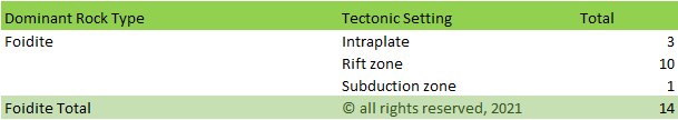 | Rocks include: | Nephelinite, leucitite, analcite and kalsilite | Rocks are named after the dominant feldspathoid |