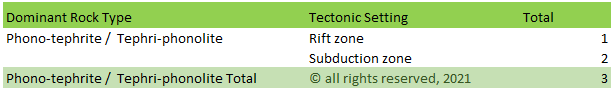 Phono-tephrite and tephri-phonolite are igneous rocks with composition between phonolite and tephrite with 45% to 57% silica content and 7% to 14% alkali oxide content.