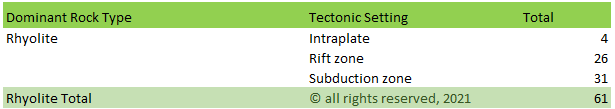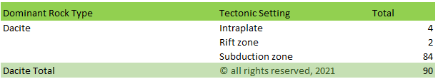| Occurrence & Formation | Formed by fractional crystallisation of more mafic magma or assimilation of sialic continental crust. Found mostly in subduction zones where oceanic crust subducts under continental crust, intra ocean island arcs, active continental margins, continental large igneous provinces and rift zones and ocean spreading centres. |