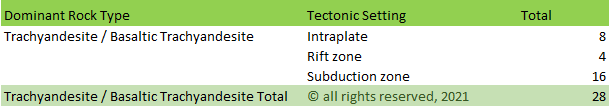Trachyandesite / Basaltic Trachyandesite lavas occur mainly in subduction zones. Well-known volcanoes in this category include El Chicon in Mexico and Stromboli in Italy.