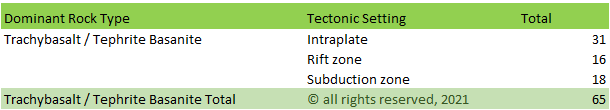 | Occurrence & Formation | Formed from the fractional crystallisation of alkaline basaltic magma. Common when alkali basalts erupt. Found in continental rift / hotspot and the late stages of ocean island volcanism. |