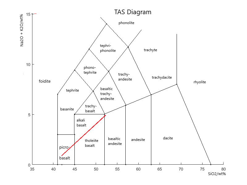 We are structuring this section round the TAS diagram used for geochemical analysis of rocks (TAS standing for total-alkalis vs silica). Here lavas are classified according to their chemical composition, focussing on the silicate, alkali (sodium and potassium oxides) and other mineral content.