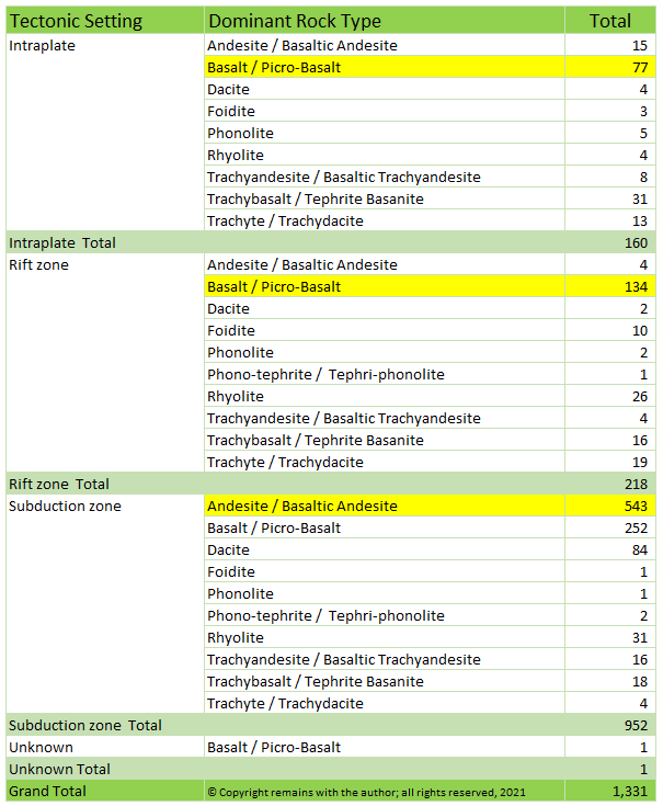 GVP, in its description of Holocene volcanoes, includes the major and minor lava types. We have summarised the dominant lava types by tectonic setting from the publicly available volcano list, downloaded as at 8 August 2021.