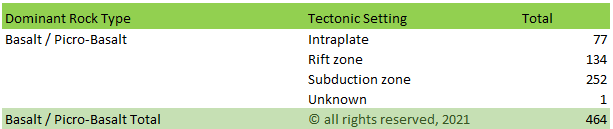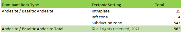 Basalt / Picro-Basalt lavas dominate intra-plate and rift zone settings, while andesite dominates subduction zone settings.