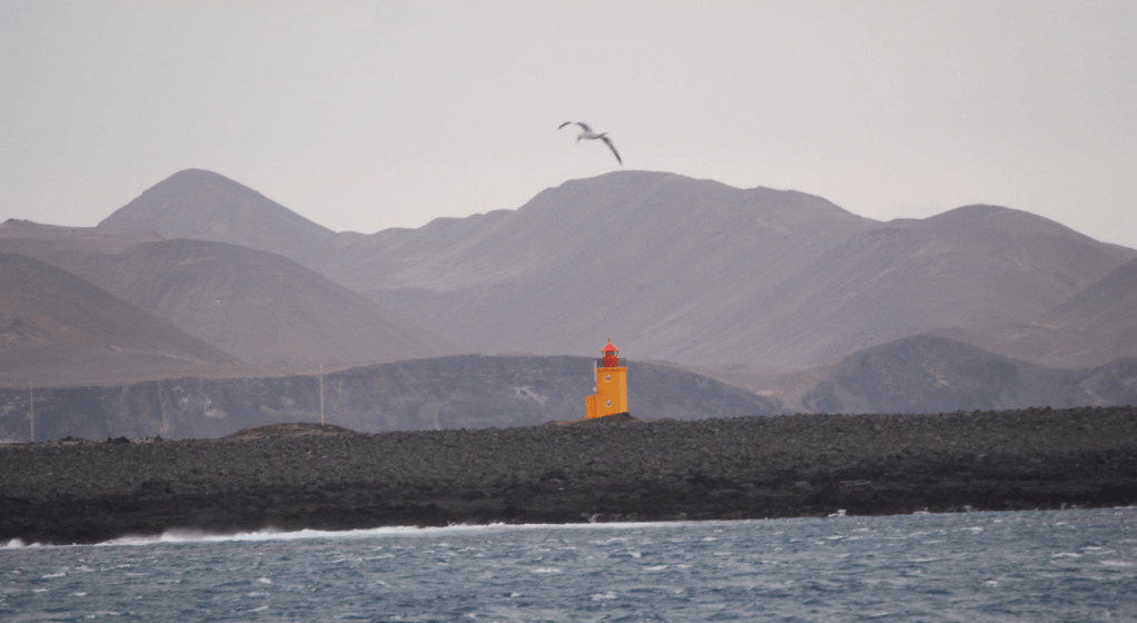 Fig 2: Hópsnes Lighthouse, Grindavik looking towards the Fagradalsfjall system. Image cropped from one by Martin Morris, published under CC-BY-SA 2.0