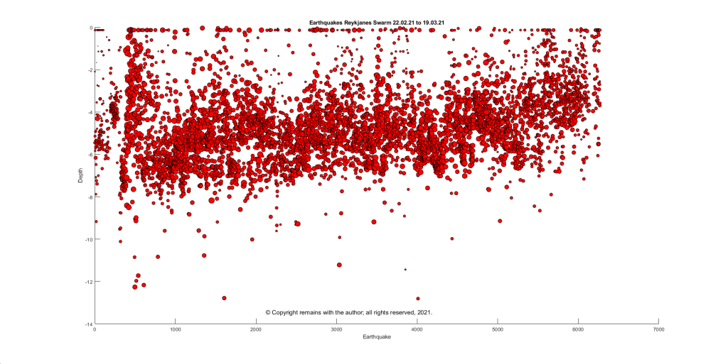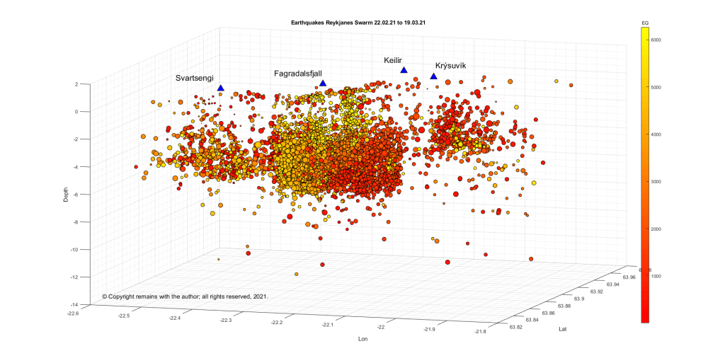 Here are the updated earthquake plots by the author, anyway. The raw earthquake data has been obtained from IMO; this is confirmed earthquakes to date (19.03.2021 15:00). IMO’s page above gives the more recent earthquakes.