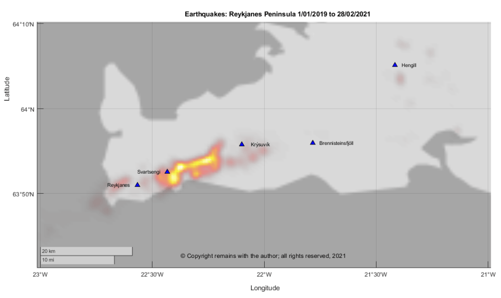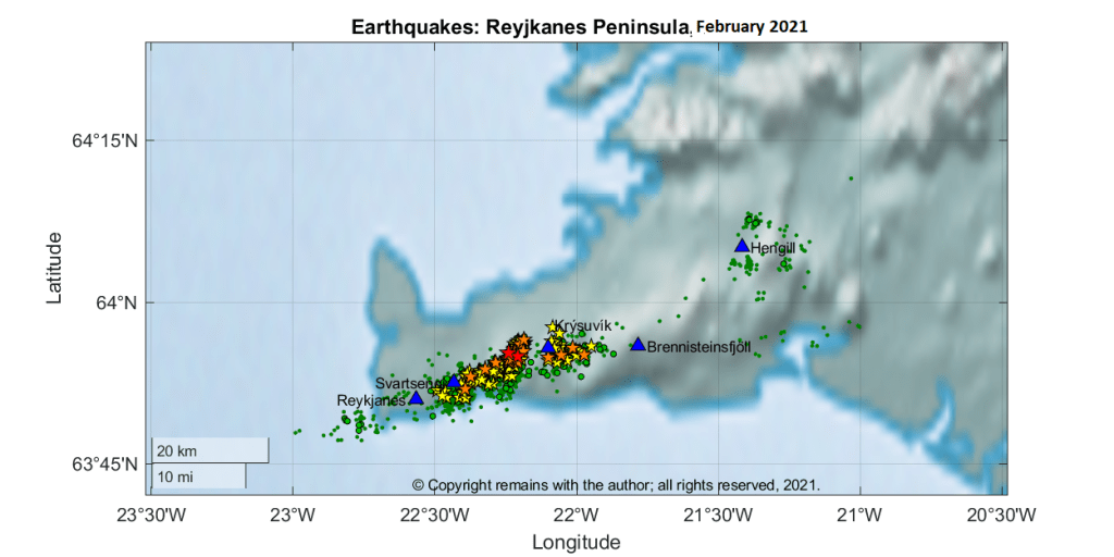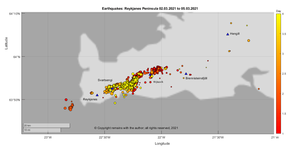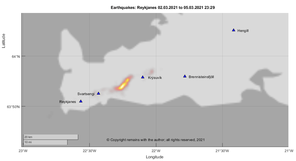 In our excitement at the thought of a possible eruption we overlooked the very real risk of larger earthquakes, if the intensity of the swarm continues: up to 6.0 M near Fagradalsfjall and up to 6.5 M in the Brennisteinfjöll range. Be careful if you are in the area.