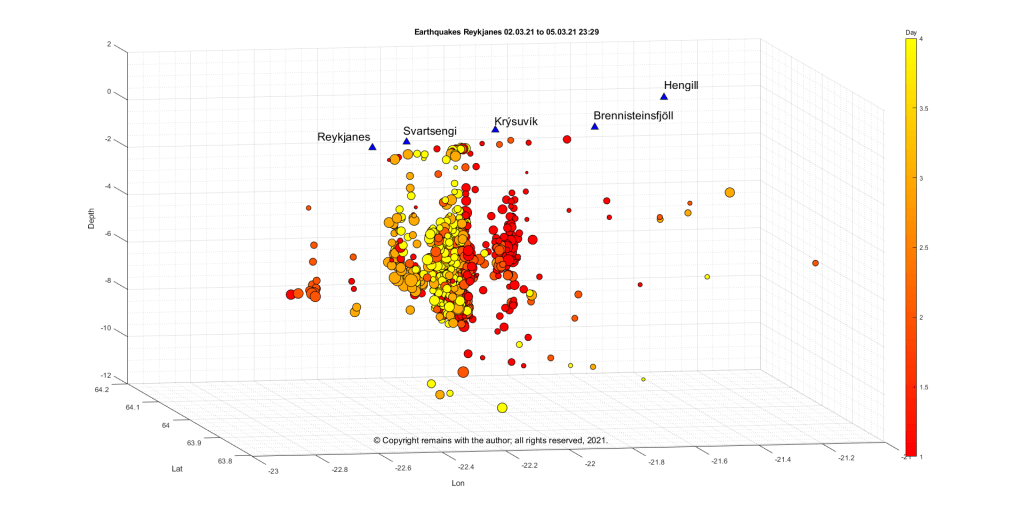We have plotted the earthquakes with a quality of 99.0 from IMO’s page showing the earthquakes for the last 48 hours for the Reykjanes Peninsula for the period 2 March 2021 to 5 March 2021 (23:29) (we were too slow to capture 1 March 2021). Here are the results. Colour coding in the scatter plots is by day and size reflects magnitude. The geodensity plot is weighted by magnitude.