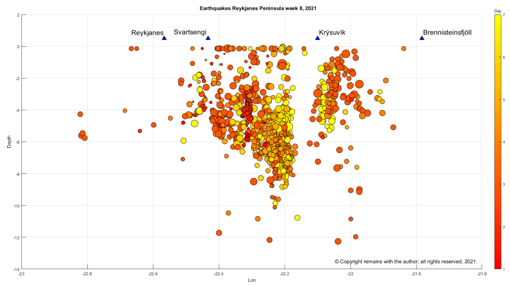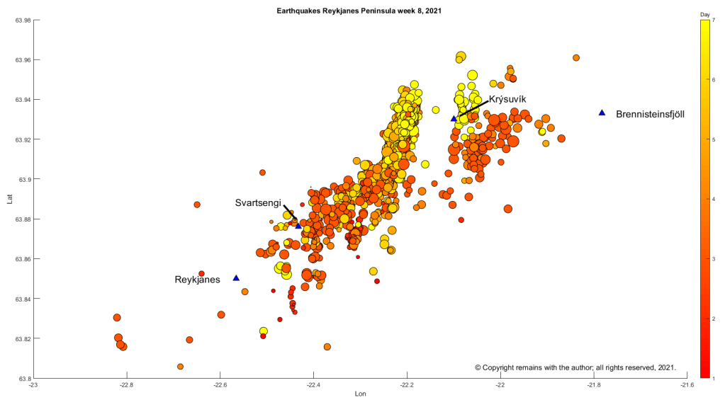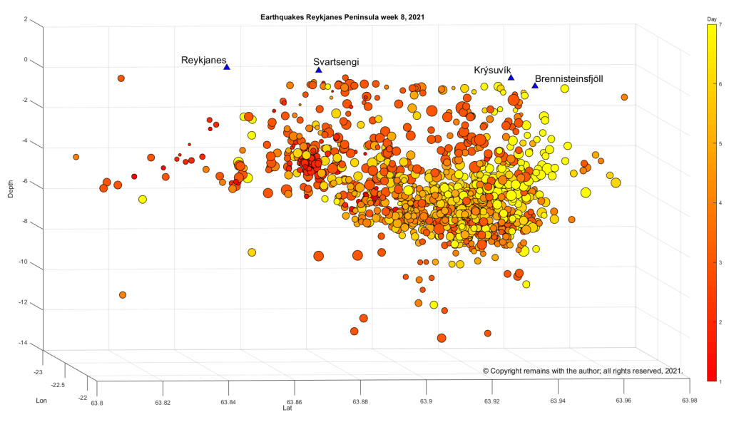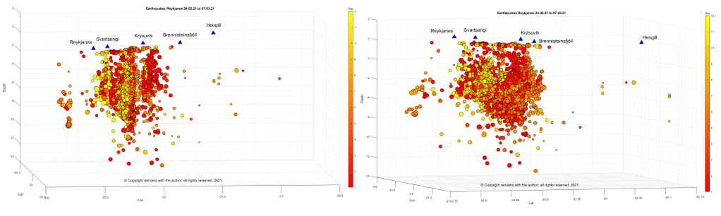 We have also produced scatter plots by day for the swarm in week 8, 2021 which show possible rifting or dike formation.