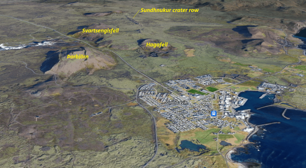 Fig 8: Bird’s eye view of the Svartsengi area and Gringavík. Image from Google Earth; yellow text added by the author.