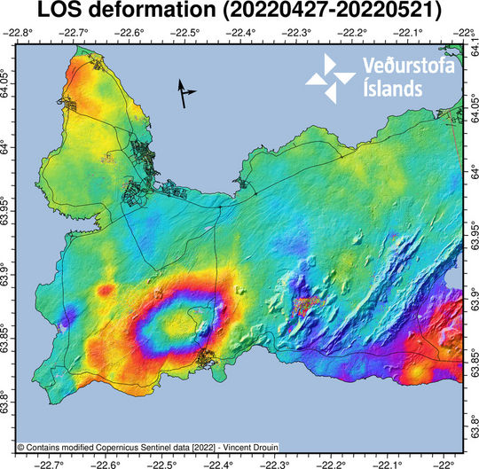 IMO reports that there has been significant uplift of 40mm to 45mm during the swarm in the area north of Grindavík indicative of magmatic activity.