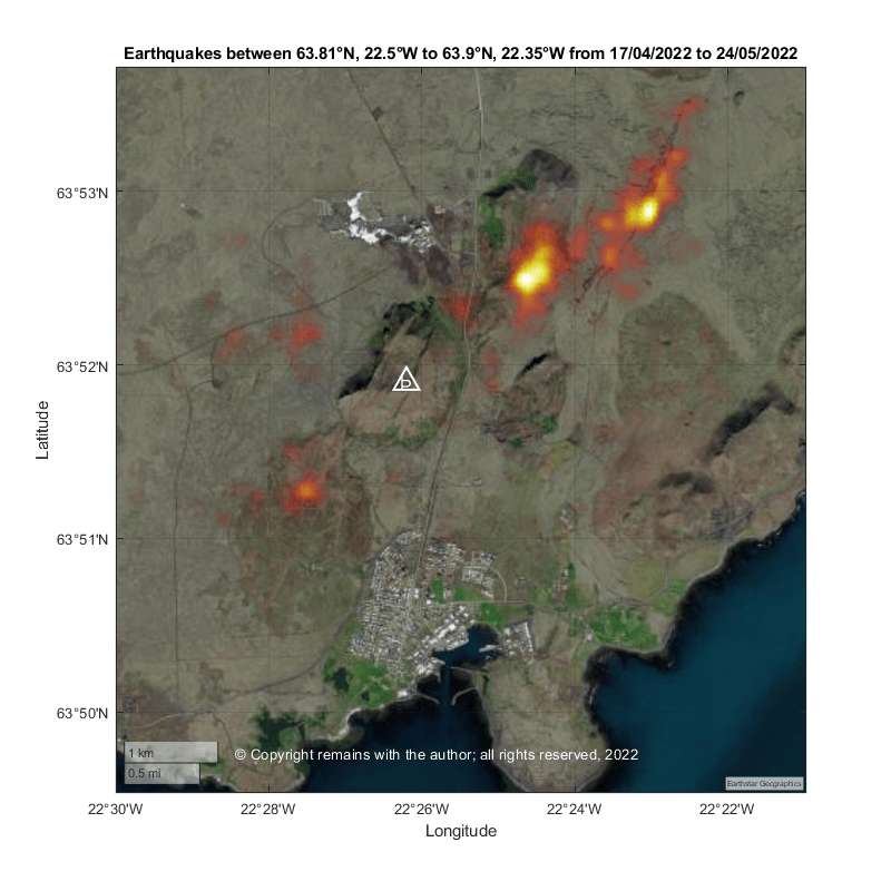 The following video shows both the geoscatter plots by day from 17th April 2022 to 26th May 2022 in the swarm for the western Reykjanes Peninsula, and the scatter plots for the same period for the area around Mount Þorbjörn.